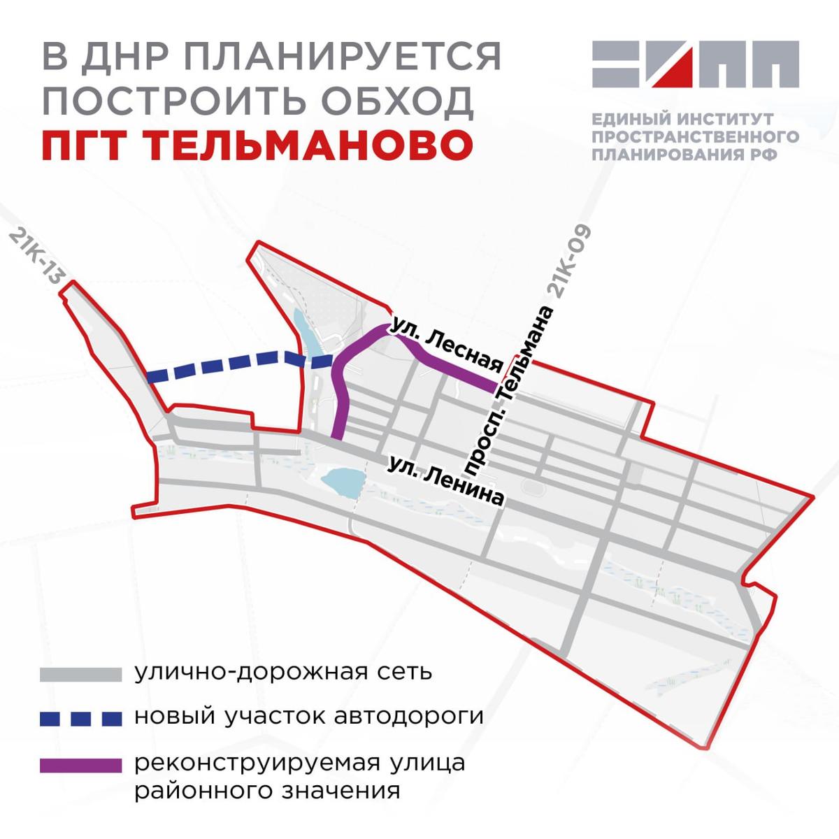 Единый институт пространственного планирования РФ в рамках разработки генерального плана Тельмановского муниципального округа Донецкой Народной Республики предложил построить северо-западный обход пгт Тельманово с целью частичного вывода из центральной части поселка транзитных транспортных потоков.